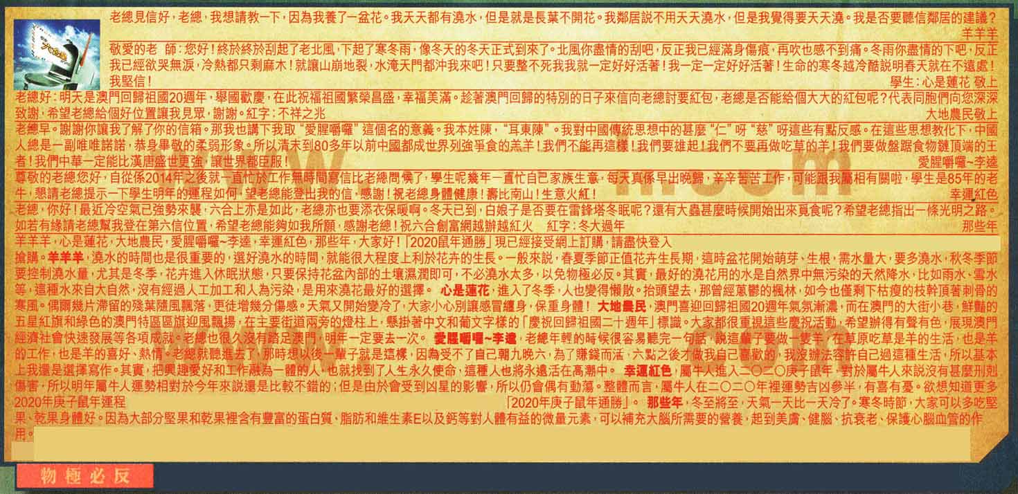 【3】老總好:明天是澳門回歸祖國20週年,舉國歡慶,在此祝福祖國繁榮昌盛,幸福美滿。趁著澳門回歸的特別的日子來信向老總討要紅包,老總是否能給個大大的紅包呢?代表同胞們向您深深致謝,希望老總給個好位置讓我見眾,謝謝。紅字:不祥之兆 大地農民敬上