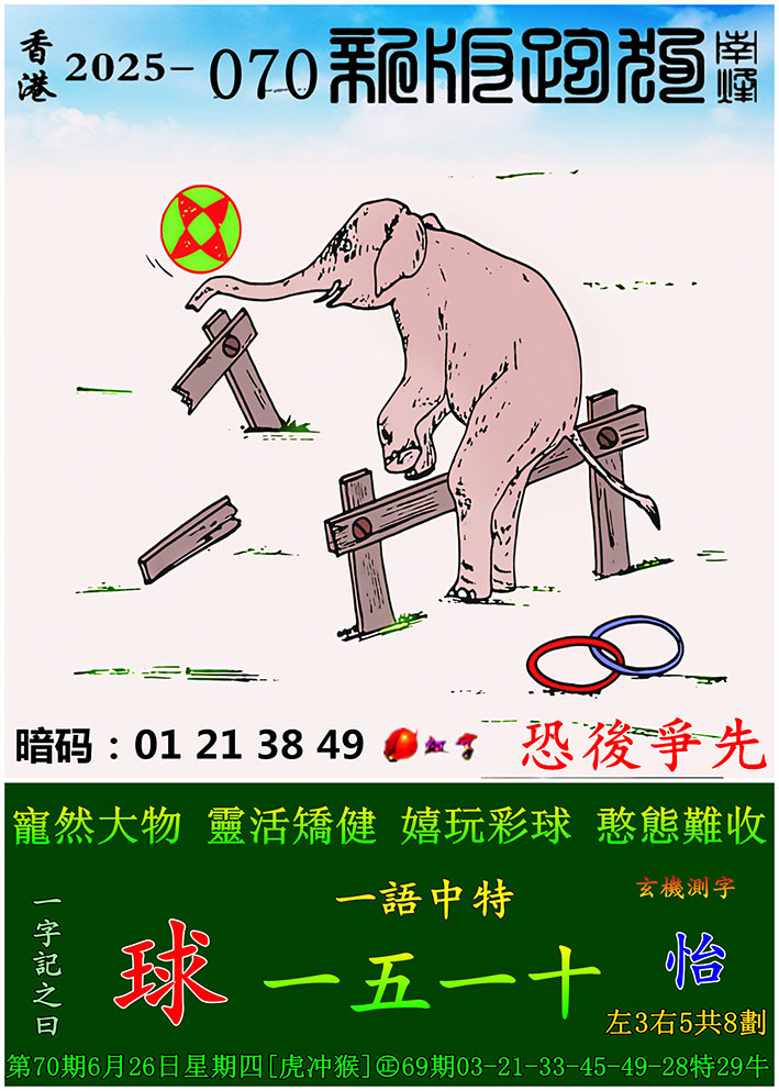 070期:新版跑狗一字記之曰【球】 玄機測字:【怡】