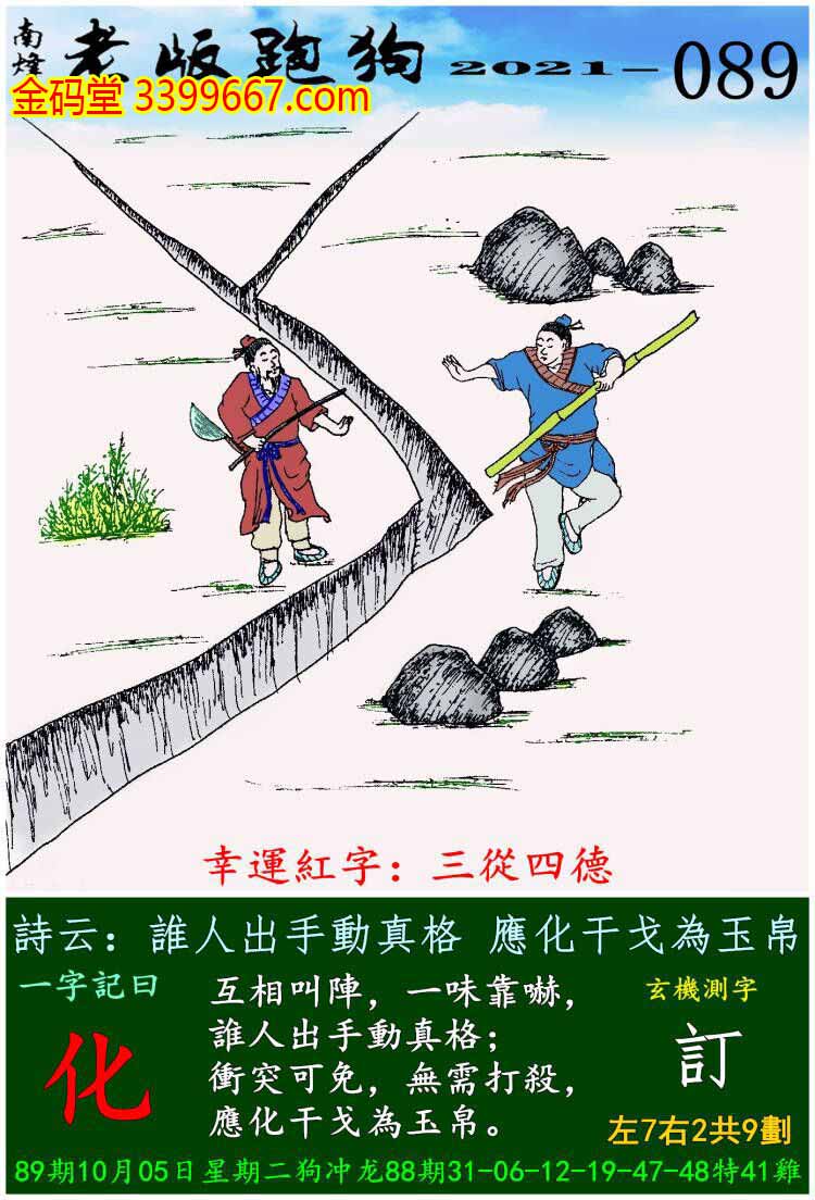 089期老版跑狗一字記之曰:【化】玄機測字:《訂》