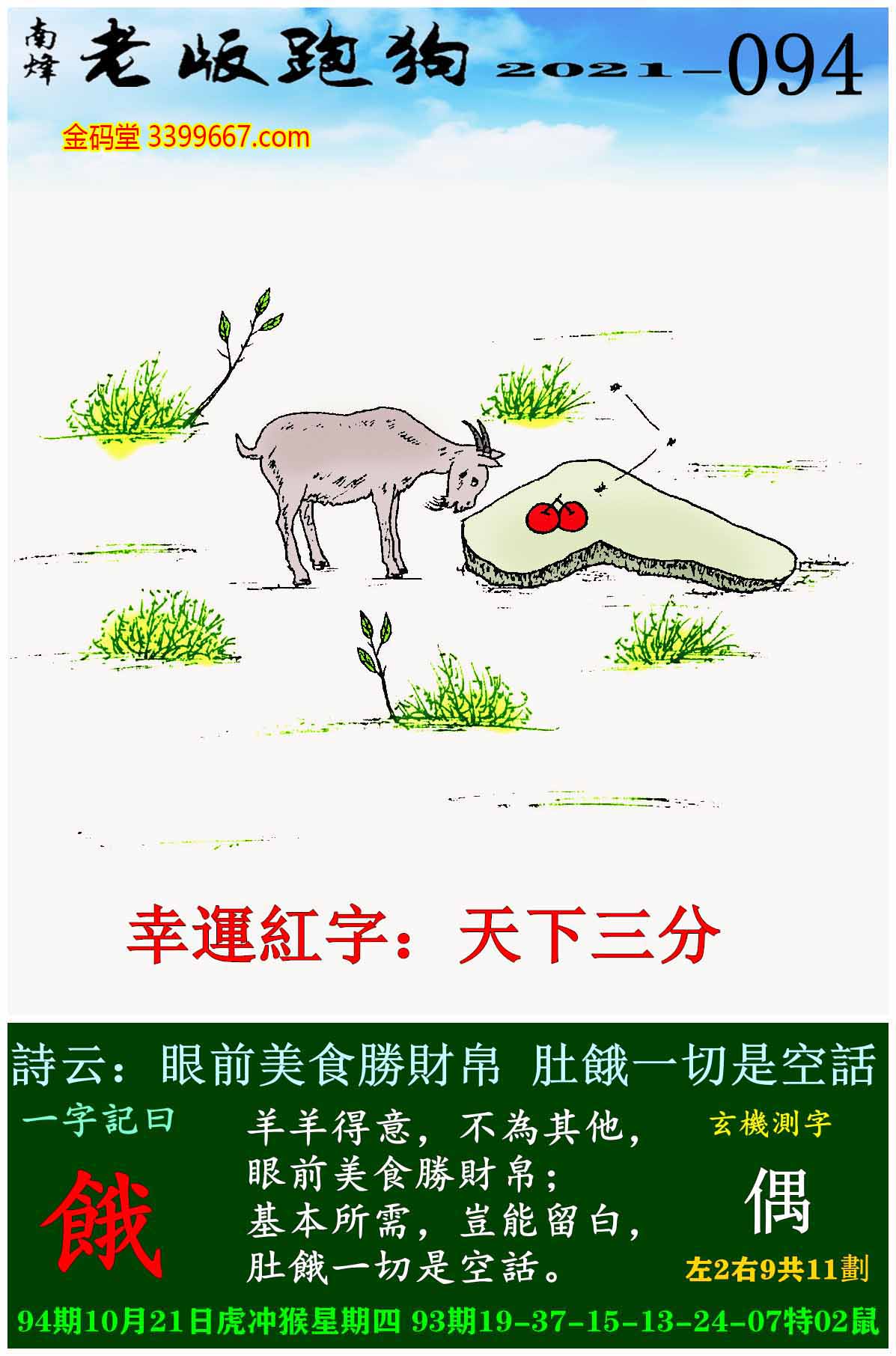 094期老版跑狗一字記之曰:【餓】玄機測字:《偶》