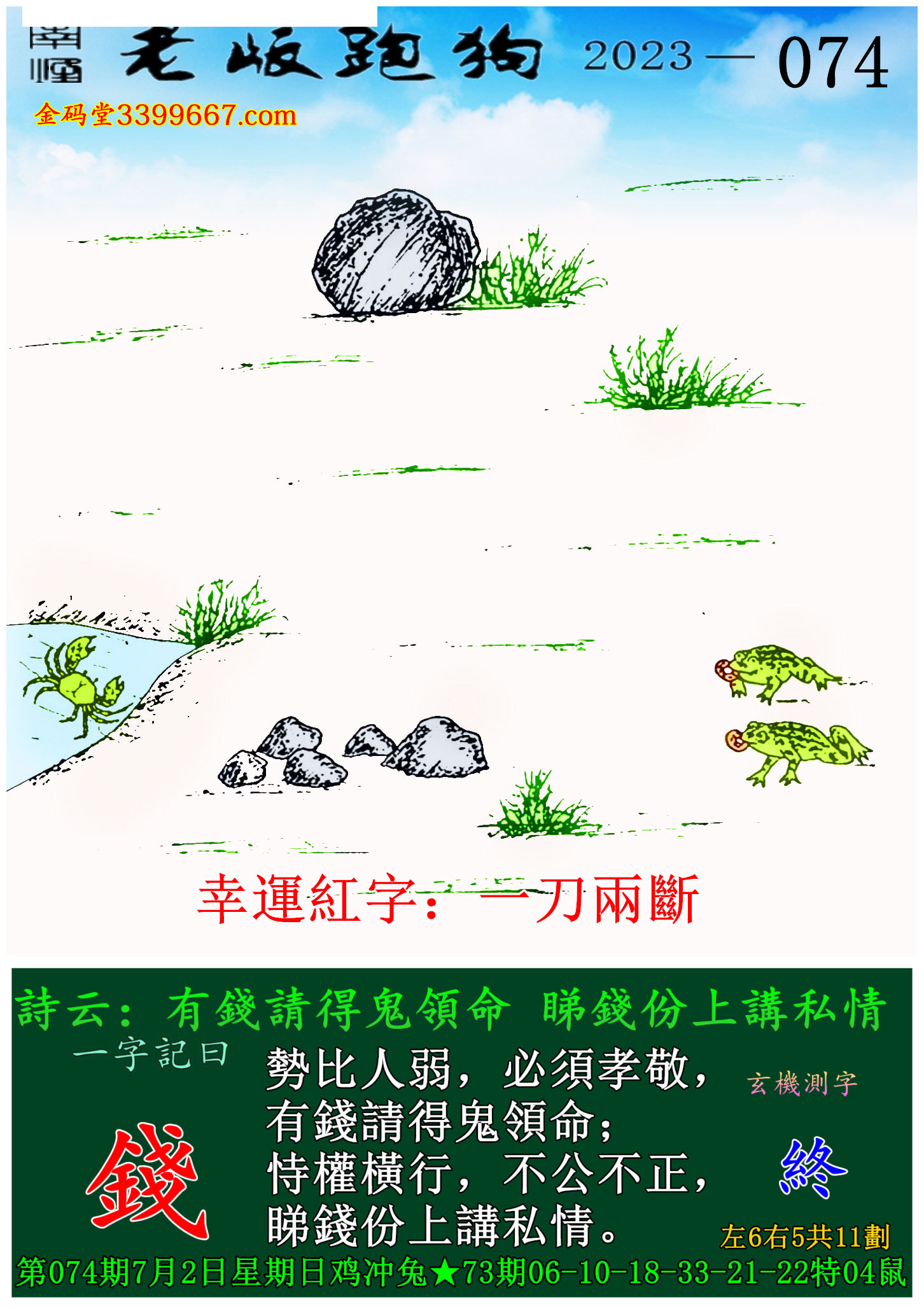 主题 : 074期老版跑狗一字記之曰:【錢】玄機測字:《終》
