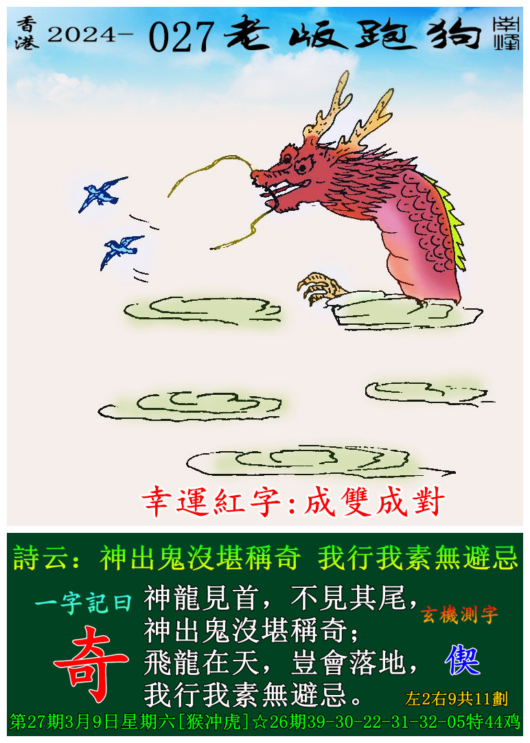 027期老版跑狗一字記之曰:【奇】 玄機測字:《偰》