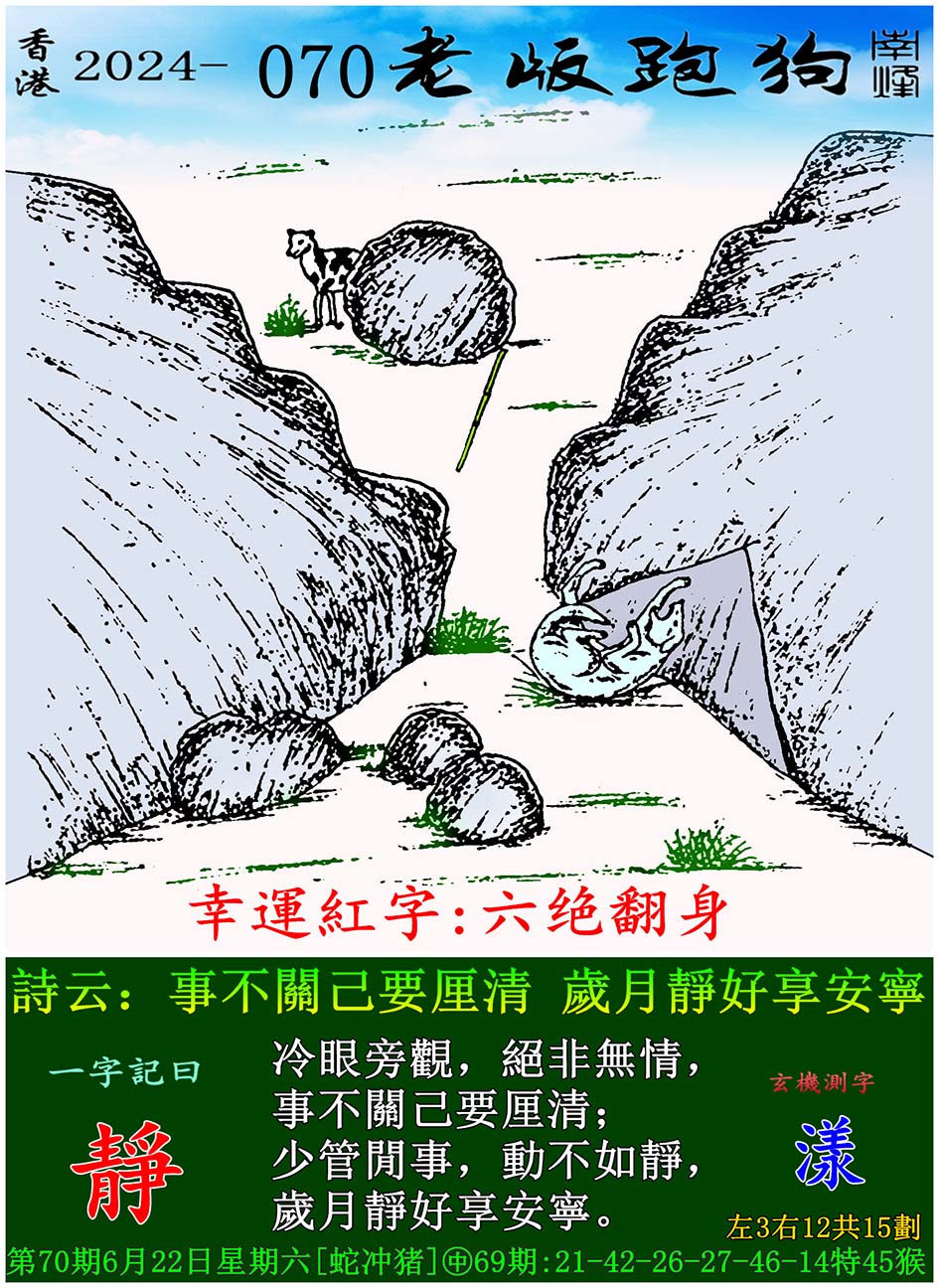 主题 : 070期老版跑狗一字記之曰:【靜】 玄機測字:《漾》