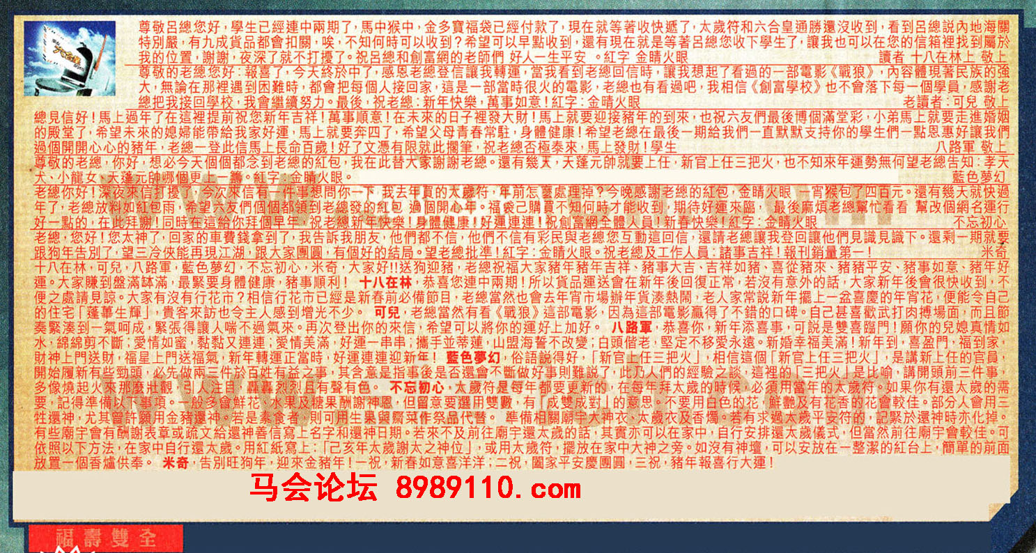 【1】尊敬呂總您好,學生已經連中兩期了,馬中猴中,金多寶福袋已經付款了,現在就等著收快遞了,太歲符和六合皇通勝還沒收到,看到呂總說內地海關特別嚴,有九成貨品都會扣關,唉,不知何時可以收到?希望可以早點收到,還有現在就是等著呂總您收下學生了,讓我也可以在您的信箱裡找到屬於我的位置,謝謝,夜深了就不打擾了。祝呂總和創富網的老師們好人一生平安。紅字 金睛火眼 ---讀者 十八在林上 敬上