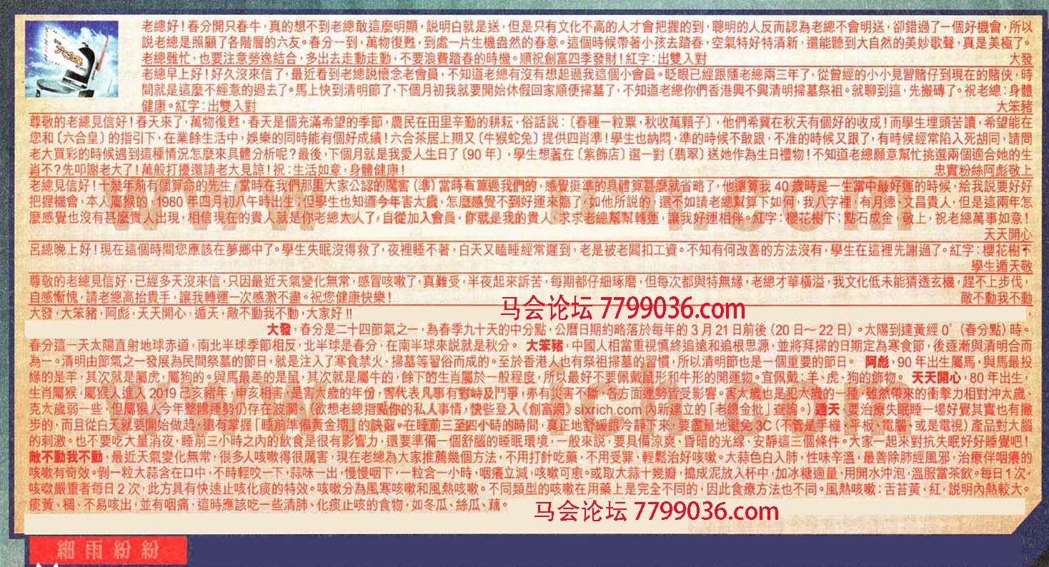大發,大笨豬,阿彪,天天開心,遁天,敵不動我不動,大家好!! 【1】.老總好!春分開只春牛,真的想不到老總敢這麼明顯,説明白就是送,但是只有文化不高的人才會把握的到,聰明的人反而認為老總不會明送,卻錯過了一個好機會,所以説老總是照顧了各階層的六友。春分一到,萬物復甦,到處一片生機盎然的春意。這個時候帶著小孩去踏青,空氣特好特清新,還能聽到大自然的美妙歌聲,真是美極了。老總雖忙,也要注意勞逸結合,多出去走動走動,不要浪費踏春的時機。順祝創富四季發財!紅字:出雙入對 大發 →〖大發〗:春分是二十四節氣之一,為春季九十天的中分點,公曆日期約略落於每年的3月21日前後(20日~22日)。太陽到達黃經0°(春分點)時。春分這一天太陽直射地球赤道,南北半球季節相反,北半球是春分,在南半球來説就是秋分。 【2】.老總早上好!好久沒來信了,最近看到老總説懷念老會員,不知道老總有沒有想起過我這個小會員。眨眼已經跟隨老總兩三年了,從曾經的小小見習賭仔到現在的賭俠,時間就是這麼不經意的過去了。馬上快到清明節了,下個月初我就要開始休假回家順便掃墓了,不知道老總你們香港興不興清明掃墓祭祖。就聊到這,先搬磚了。祝老總:身體健康。紅字:出雙入對 大笨豬 →〖大笨豬〗:中國人相當重視慎終追遠的追根思源,並將拜掃的日期定為寒食節,後逐漸與清明合而為一。清明由節氣之一發展為民間祭墓的節日,就是注入了寒食禁火、掃墓等習俗而成的。至於香港人也有祭祖掃墓的習慣,所以清明節也是一個重要的節日。 【3】.尊敬的老總見信好!春天來了,萬物復甦,春天是個充滿希望的季節,農民在田里辛勤的耕耘,俗話説:〔春種一粒粟,秋收萬顆子〕,他們希冀在秋天有個好的收成!而學生埋頭苦讀,希望能在您和〔六合皇〕的指引下,在業餘生活中,娛樂的同時能有個好成績!六合茶居上期又〔牛猴蛇兔〕提供四肖準!學生也納悶,準的時候不敢跟,不准的時候又跟了,有時候經常陷入死胡同,請問老大買彩的時候遇到這種情況怎麼來具體分析呢?最後,下個月就是我愛人生日了〔90年〕,學生想著在〔紫飾店〕選一對〔翡翠〕送她作為生日禮物!不知道老總願意幫忙挑選兩個適合她的生肖不?先叩謝老大了!萬般打擾還請老大見諒!祝:生活如意,身體健康! 忠實粉絲阿彪敬上 →〖阿彪〗:90年出生屬馬,與馬最投緣的是羊,其次就是屬虎,屬狗的。與馬最差的是鼠,其次就是屬牛的,餘下的生肖屬於一般程度,所以最好不要佩戴鼠形和牛形的開運物。宜佩戴:羊、虎、狗的飾物。 【4】.老總見信好!十幾年前有個算命的先生,當時在我們那里大家公認的厲害(準)當時有算過我們的,感覺挺準的具體算甚麼就省略了,他還算我40歲時是一生當中最好運的時候,給我説要好好把握機會,本人屬猴的,1980年四月初八午時出生;但學生也知道今年害太歲,怎麼感覺不到好運來臨了,如他所説的,還不如請老總幫算下如何,我八字裡,有月德、文昌貴人,但是這兩年怎麼感覺也沒有甚麼貴人出現,相信現在的貴人就是你老總大人了,自從加入會員,你就是我的貴人,求求老總幫幫轉運,讓我好運相伴。紅字:櫻花樹下;點石成金,敬上,祝老總萬事如意! 天天開心 →〖天天開心〗:80年出生,生肖屬猴,屬猴人進入2019己亥豬年,申亥相害,是害太歲的年份,害代表凡事有對峙及鬥爭,亦有災害不斷,各方面運勢皆受影響。害太歲也是犯太歲的一種,雖然帶來的衝擊力相對沖太歲、克太歲弱一些,但屬猴人今年整體運勢仍存在波瀾。 【5】.呂總晚上好!現在這個時間您應該在夢鄉中了。學生失眠沒得救了,夜裡睡不著,白天又瞌睡經常遲到,老是被老闆扣工資。不知有何改善的方法沒有,學生在這裡先謝過了。紅字:櫻花樹下 學生遁天敬 →〖遁天〗:要治療失眠睡一場好覺其實也有撇步的,而且從白天就要開始做起,還有掌握「睡前準備黃金期」的訣竅。在睡前三至四小時的時間,真正地舒緩跟冷靜下來,要盡量地避免3C(不管是手機、平板、電腦、或是電視)產品對大腦的刺激。也不要吃大量消夜,睡前三小時之內的飲食是很有影響力,還要準備一個舒腦的睡眠環境,一般來説,要具備涼爽、昏暗的光線、安靜這三個條件。大家一起來對抗失眠好好睡覺吧! 【6】.尊敬的老總見信好,已經多天沒來信,只因最近天氣變化無常,感冒咳嗽了,真難受,半夜起來訴苦,每期都仔細琢磨,但每次都與特無緣,老總才華橫溢,我文化低未能猜透玄機,趕不上步伐,自感慚愧,請老總高抬貴手,讓我轉運一次感激不盡。祝您健康快樂! 敵不動我不動 →〖敵不動我不動〗:最近天氣變化無常,很多人咳嗽得很厲害,現在老總為大家推薦幾個方法,不用打針吃藥,不用受罪,輕鬆治好咳嗽。大蒜色白入肺,性味辛溫,最善除肺經風邪,治療伴咽癢的咳嗽有奇效。剝一粒大蒜含在口中,不時輕咬一下,蒜味一出,慢慢咽下,一粒含一小時,咽癢立減,咳嗽可愈。或取大蒜十幾瓣,搗成泥放入杯中,加冰糖適量,用開水沖泡,溫服當茶飲。每日1次,咳嗽嚴重者每日2次,此方具有快速止咳化痰的特效。咳嗽分為風寒咳嗽和風熱咳嗽。不同類型的咳嗽在用藥上是完全不同的,因此食療方法也不同。風熱咳嗽:舌苔黃、紅,説明內熱較大。痰黃、稠、不易咳出,並有咽痛,這時應該吃一些清肺、化痰止咳的食物,如冬瓜、絲瓜、藕。
