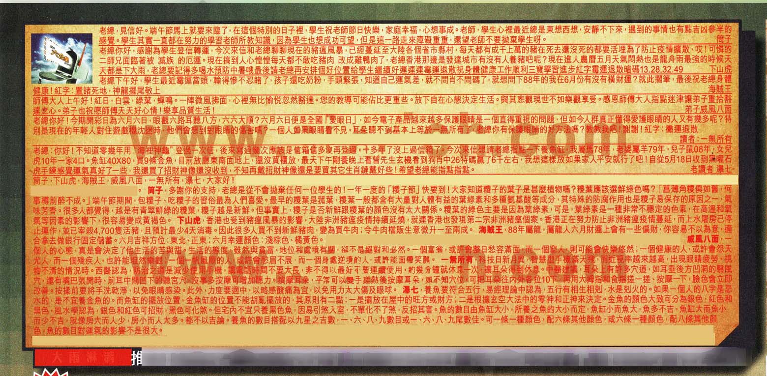 【2】老總你好,感謝為學生登信轉運,今次來信和老總聊聊現在的豬瘟風暴,已經蔓延至大陸各個省市縣村,每天都有成千上萬的豬在死去還沒死的都要活埋為了防止疫情擴散哎!可憐的三師兄面臨著被减族的厄運。現在搞到人心惶惶每天都不敢吃猪肉改成雞鴨肉了,老總香港那邊是發達城市有沒有人養豬吧呢?現在進人農曆五月天氣悶熱,也是龍舟雨最強的時候↑天天都是下大雨,老總要記得多喝水預防中暑哦!最後請老總再安排個好位置給學生,繼續好運連連,霉運退散祝身體健康,工作顺利,三寶學習進步。紅字:霉運退散暗碼13.28.32.49 ---下山虎
