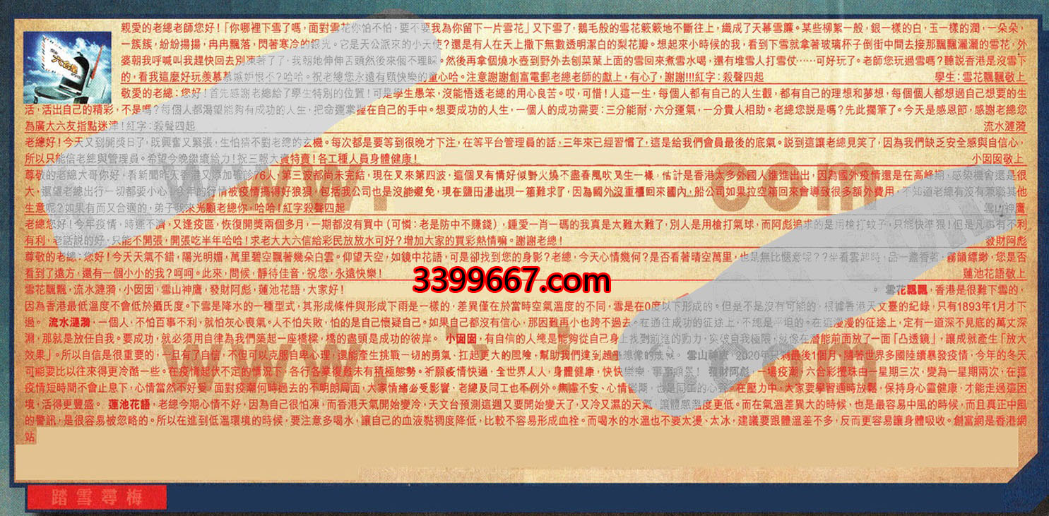 【3】.老總好!今天又到開獎日了,既興奮又緊張,生怕猜不對老總的玄機。每次都是要等到很晚才下注,在等平台管理員的話,三年來已經習慣了,這是給我們會員最後的底氣。說到這讓老總見笑了,因為我們缺乏安全感與自信心,所以只能信老總與管理員。希望今晚繼續給力!祝三報大賣特賣!各工種人員身體健康 小囡囡敬上