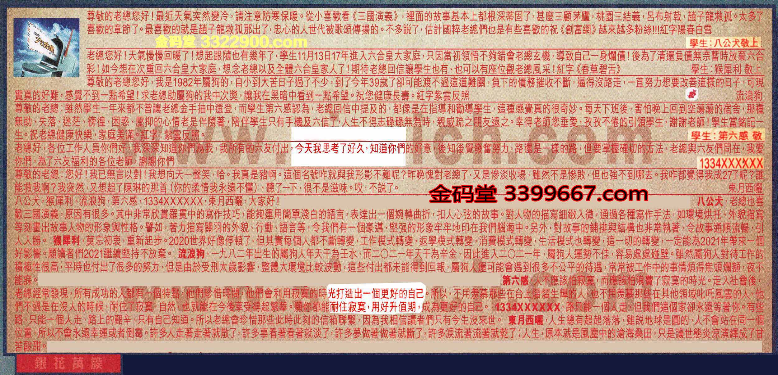 【4】.尊敬的老總:雖然學生一年來都不曾讓老總金手抽中選登,而學生第六感認為,老總回信中提及的,都像是在指導和勸導學生,這種感覺真的很奇妙。每天下班後,害怕晚上回到空蕩蕩的宿舍,那種無助、失落、迷茫、彷徨、困惑、壓抑的心情老是伴隨著,陪伴學生只有手機及六信了,人生不得志碌碌無為時,親戚疏之朋友遠之。幸得老師您垂愛,孜孜不倦的引領學生,謝謝老師!學生當銘記一生。祝老總健康快樂,家庭美滿。紅字:紫雲反照。 學生:第六感 敬