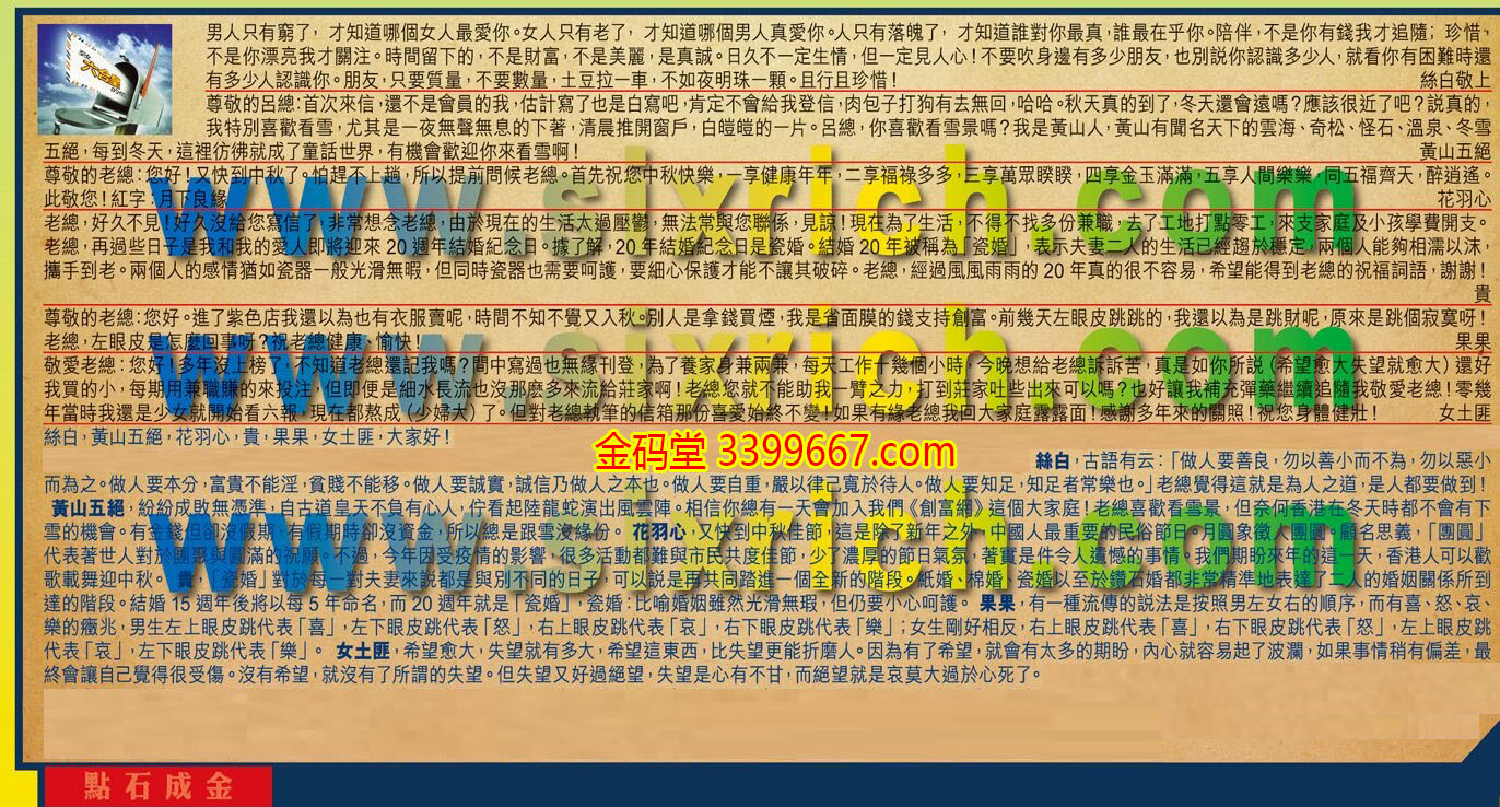 【3】.呂總:見信好!不知道您還會記得「沙井逆風」這名字?2000年開始接觸六he皇,2013年中國雅虎郵箱關閉就很少去信,21年以來一直關注著六he皇,差不多7年來沒去信,為生活忙綠奔波種種原因,極少寫信,近來搞個燈飾廠,準備開業,想請老總看看燈飾廠9月30號開業這個日子好不好?謝謝!紅字:點石成金  沙井逆風敬上