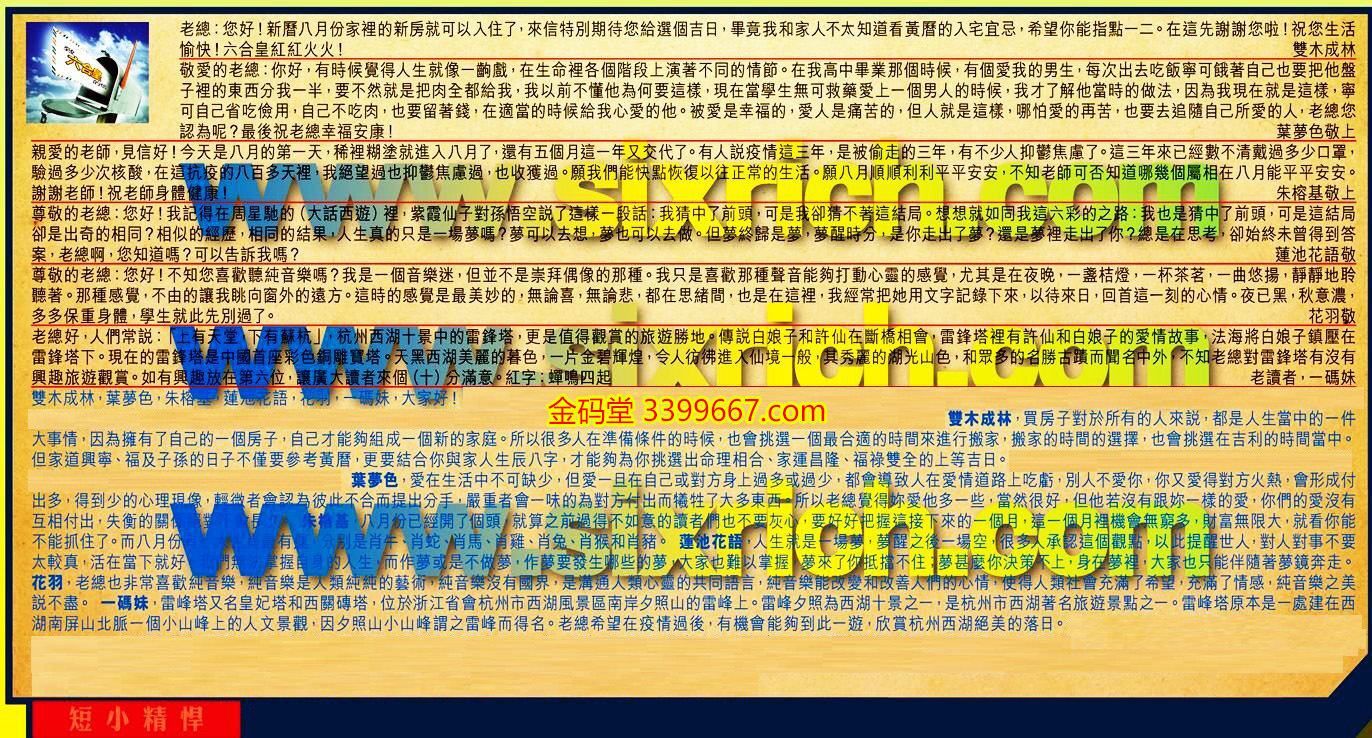 【3】.親愛的老師,見信好!今天是八月的第一天,稀裡糊塗就進入八月了,還有五個月這一年又交代了。有人說疫情這三年,是被偷走的三年,有不少人抑鬱焦慮了。這三年來已經數不清戴過多少口罩,驗過多少次核酸,在這抗疫的八百多天裡,我絕望過也抑鬱焦慮過,也收獲過。願我們能快點恢復以往正常的生活。願八月順順利利平平安安,不知老師可否知道哪幾個屬相在八月能平平安安。謝謝老師祝老師身體健康!  朱榕基敬上