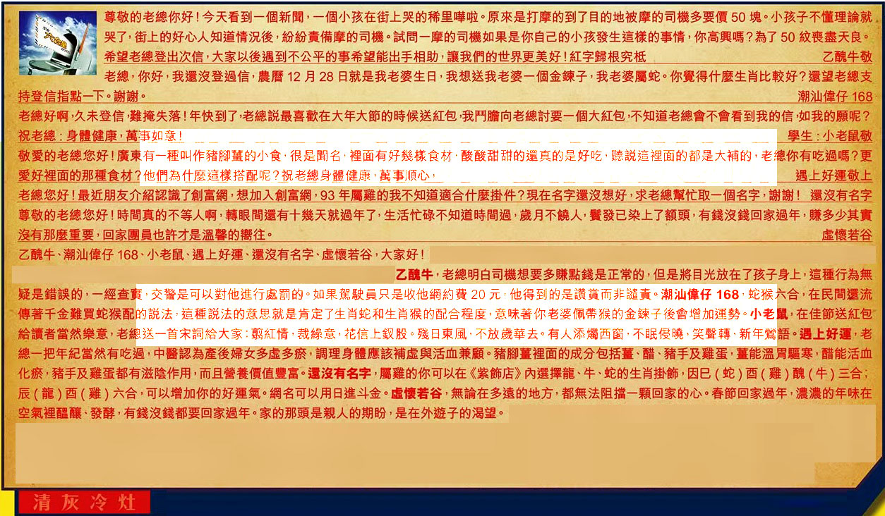 【2】.老總,你好,我還沒登過信,農曆 12 月 28 日就是我老婆生日,我想送我老婆一個金鍊子,我老婆屬蛇。你覺得什麼生肖比較好?還望老總支持登信指點一下。謝謝。 潮汕偉仔168