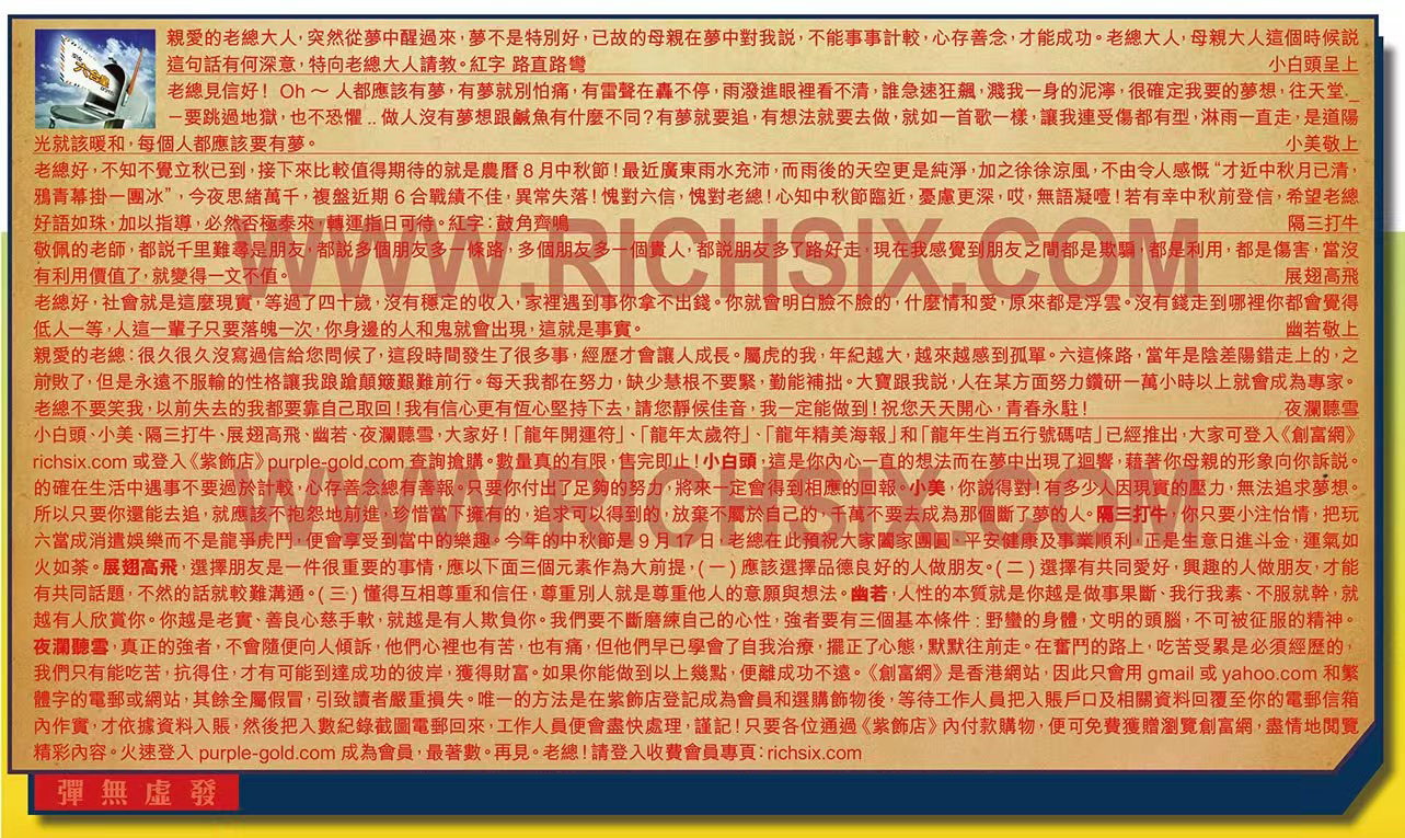 【3】.老總好,不知不覺立秋已到,接下來比較值得期待的就是農曆8月中秋節!最近廣東雨水充沛,而雨後的天空更是純淨,加之徐徐涼風,不由令人感慨“才近中秋月已清, 鴉青幕掛一團冰”,今夜思緒萬千,複盤近期6合戰績不佳,異常失落!愧對六信,愧對老總!心知中秋節臨近,憂慮更深,哎,無語凝噎!若有幸中秋前登信,希望老總 好語如珠,加以指導,必然否極泰來,轉運指日可待。紅字:鼓角齊鳴 隔三打牛