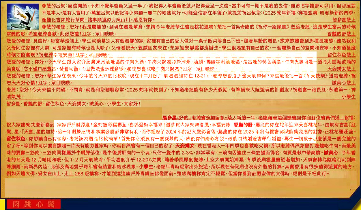 【1】.尊敬的呂叔:展信開顏。不知不覺年會員又過一半了,我記得入年會員後就只記得登過次信。當中可有一期不是我的去信,雖然名字誰都可以用 ,但那絕對不是本人。是有人冒用了。萬望呂叔以後記得小弟獨一無二的帳號就好。可能登信都在年後了,就提前祝呂叔您:(2025蛇年新禧,祥福並濟,盼君於新的四季,逢難化吉如蛇行草間,諸事順遂似月照山川。感恩有你。 智多星敬上