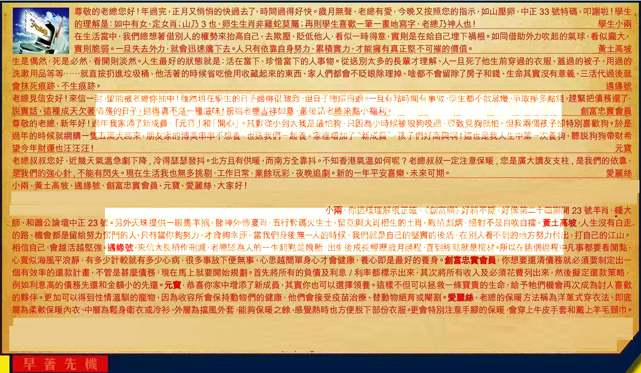 【1】.尊敬的老總您好!年過完,正月又悄悄的快過去了,時間過得好快。歲月無聲,老總有愛,今晚又按照您的指示,如山壓卵,中正33號特碼,叩謝啦!學生的理解是:如中有女,定女肖山乃3也,卵生生肖非雞蛇莫屬;再則學生喜歡一筆一畫地寫字,老總乃神人也!  學生小兩
